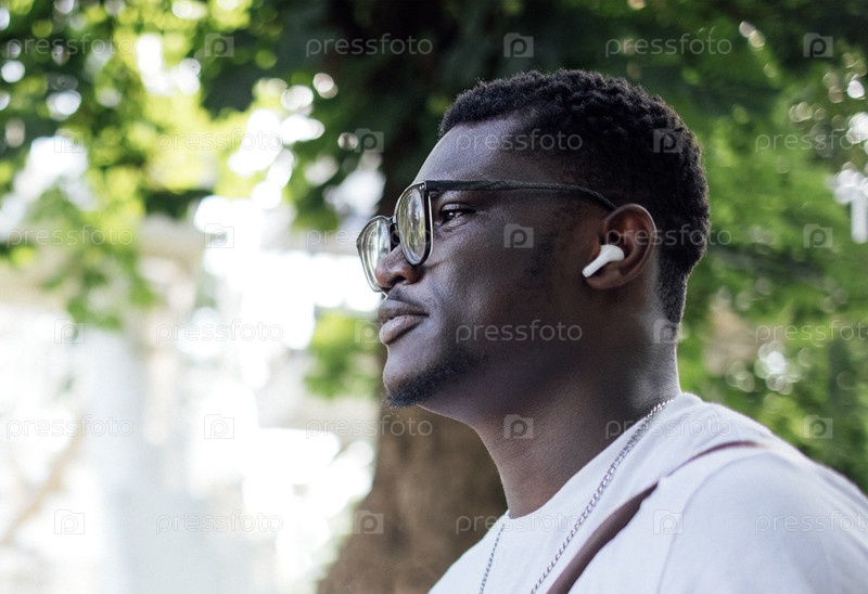 Африканский американец с очками и беспроводными наушниками стоит снаружи, в окружении пышной зелени, наслаждаясь музыкой, размышляя над жизнью в спокойной обстановке