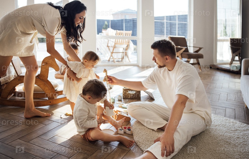 Семья наслаждается качественным временем вместе в яркой гостиной, где дети играют на полу и родители занимаются воспитанием детей, создавая теплую атмосферу любви и связей