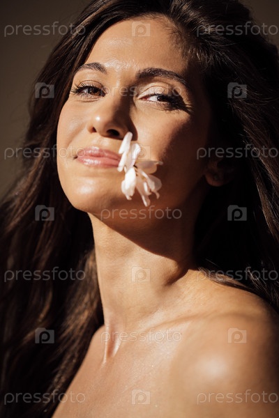 Женщина с длинными темными волосами и натуральным макияжем мягко улыбается, украшенная нежными лепестками цветов на щеке, захватывая момент красоты и спокойствия в естественном свете