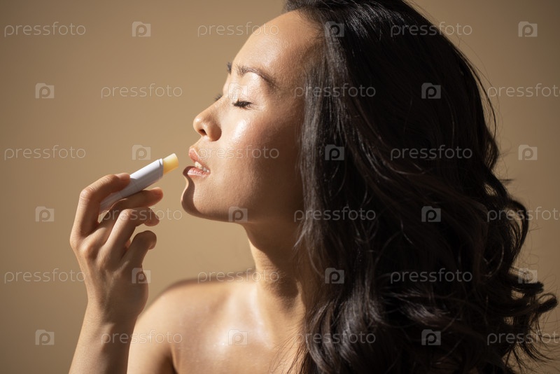 Азиатская женщина наносит бальзам для губ с нежным выражением лица, демонстрируя рутину ухода за кожей, освещенную мягким естественным светом, подчеркивая красоту и концепцию самообслуживания