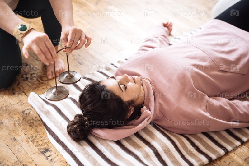 Женщина лежит на полосатом коврике, получая звуковую терапию с помощью певчих мисок, в то время как другой человек нежно держит миски над ней, создавая успокаивающую атмосферу для расслабления и исцеления