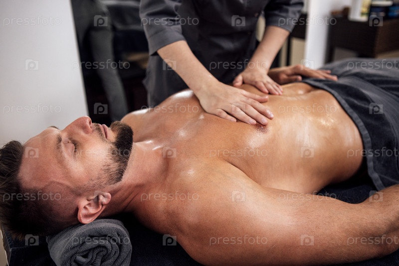 Клиент мужского пола получает расслабляющий массаж в спокойной спа-среде, с мягким освещением и успокаивающим декором, способствуя исцелению и релаксации посредством терапевтического прикосновения