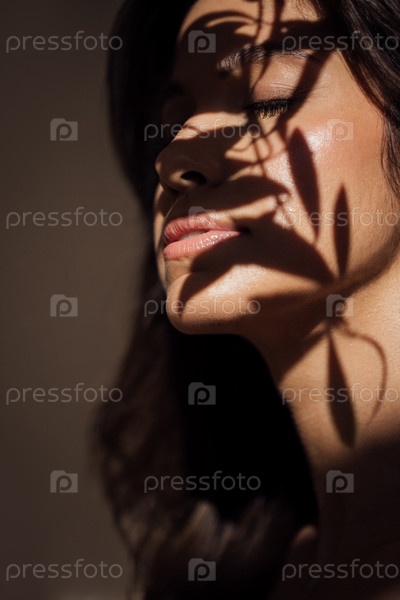 Женщина с длинными темными волосами, освещенная мягким светом, имеет тени на лице от близлежащих растений, создавая спокойную и художественную атмосферу в минималистической обстановке