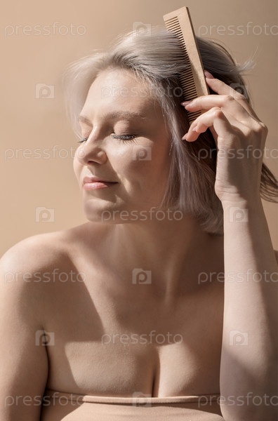 Женщина с короткими блондинками нежно расчесывает волосы деревянным гребнем, показывая спокойное выражение на мягком бежевом фоне, подчеркивая красоту и самообслуживание