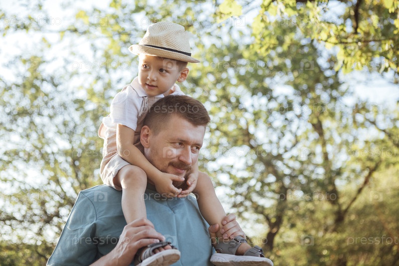 Мальчик в соломенной шляпе радостно едет на плечах своего отца в солнечном парке, окруженном пышной зеленью и теплой веселой атмосферой