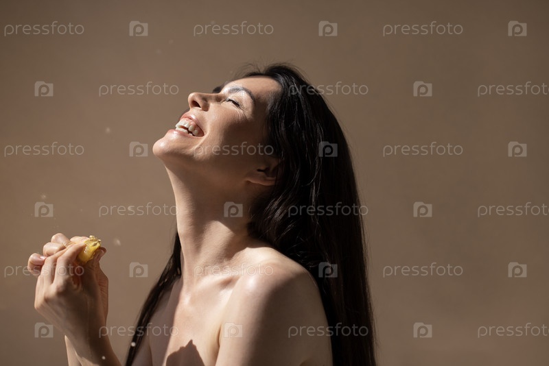 Веселая женщина с длинными темными волосами, наслаждающаяся куском цитрусовых фруктов, освещенных мягким естественным светом, передавая чувство счастья и освежения в спокойной атмосфере