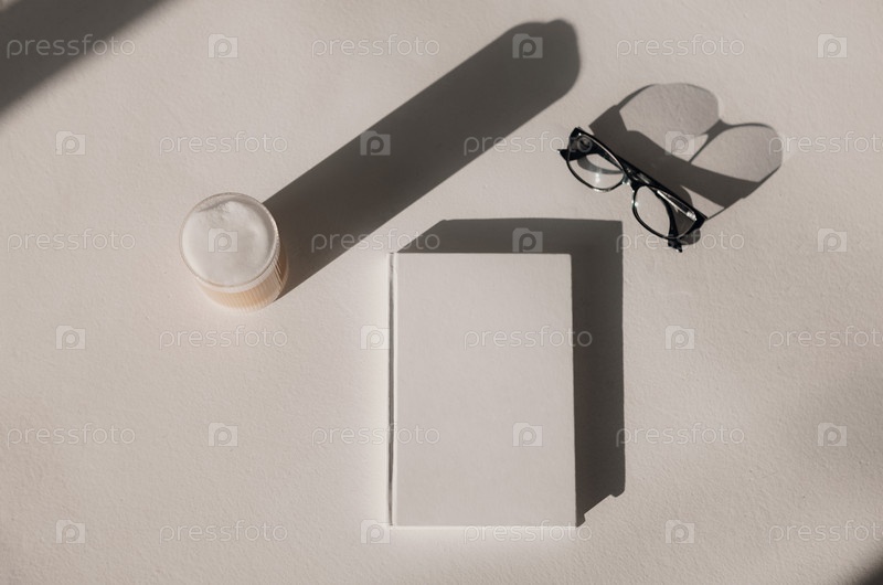 Минималистская композиция из плоской кладки с белой книгой, бокалом напитка и стильными очками на мягкой текстурированной поверхности с естественным светом, создавая тени