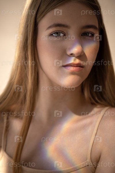 Молодая женщина с длинными волосами и мягкими чертами лица, освещенная естественным светом, показывая отражение радуги на лице, захватывающую спокойный и эфирный момент красоты
