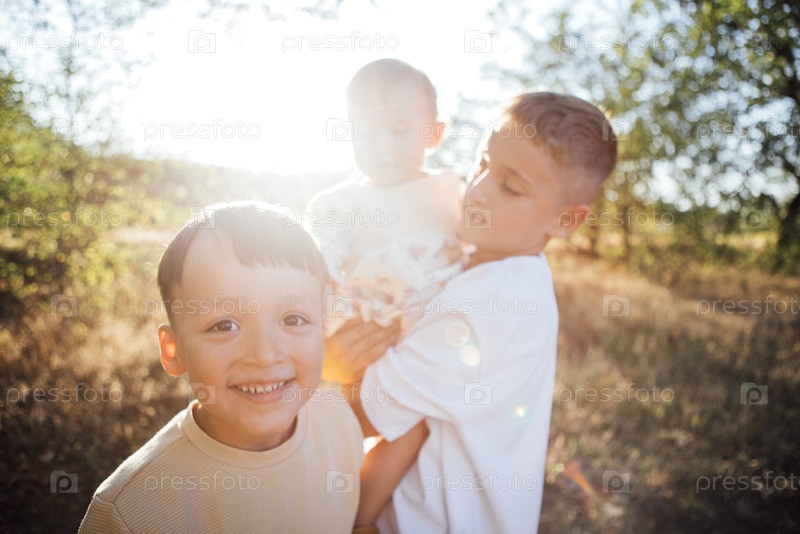 Два маленьких мальчика, один из которых держит ребенка, радостно улыбаются в солнечной атмосфере на открытом воздухе, окруженные зеленью, захватывая момент детского счастья и связи