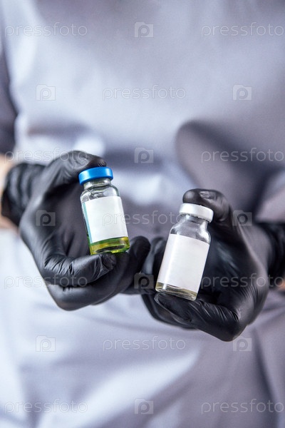 Медицинский работник в черных перчатках держит две флаконы, одна с голубой крышкой и другая с белой, демонстрирующие фармацевтические продукты в клинической обстановке