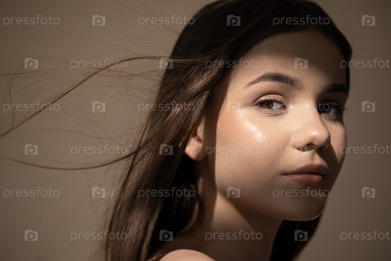 Молодая женщина с длинными волосами, освещенная мягким светом, смотрит через плечо и захватывает момент спокойной красоты и элегантности в минималистической обстановке
