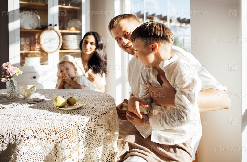 Семья наслаждается качественным временем вместе в оживленной кухне, с солнечным светом, проходящим через окна, создавая теплую и привлекательную атмосферу для укрепления связей и связи