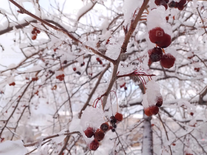 Заснеженные ветви яблони - ракеты с красными ягодами зимой
