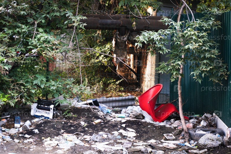 Естественная свалка с красным пластиковым стулом во дворе