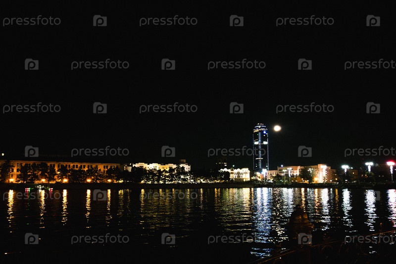 Ночной город на набережной с отражением огней в воде, Екатеринбург