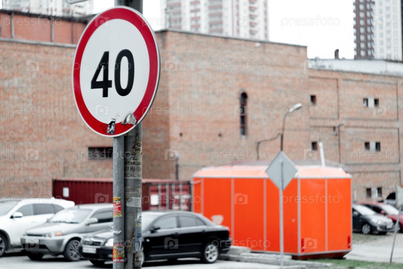 Дорожные знаки ограничения скорости 40 км / ч на городской улице с припаркованными автомобилями