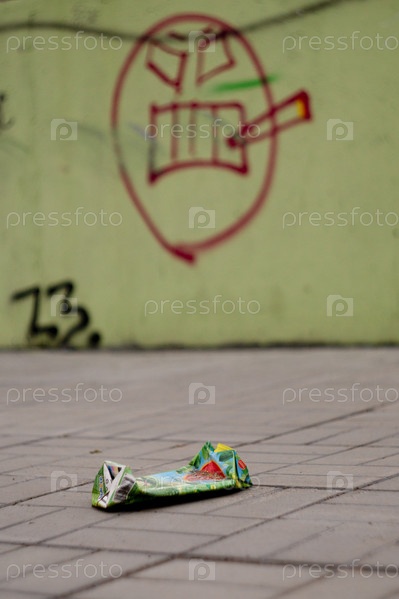 Сморщенная упаковка на тротуаре и граффити с сердитым лицом на стене