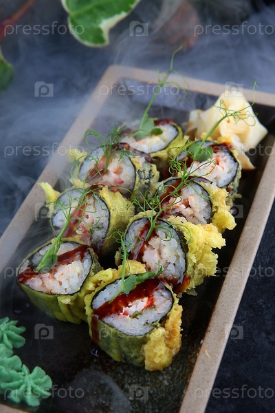 Цезарь Темпура едет с копченой курицей и помидорами. Традиционная японская кухня. Темпура Эби. Черный фон и дым