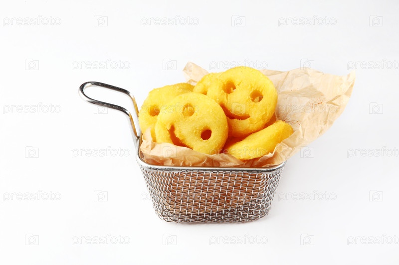 Забавная еда для детей. Картофельное пюре, жареное в форме улыбки. Корзина картофельного пюре в форме улыбок. Детское меню. Место для копирования. Изолированный объект