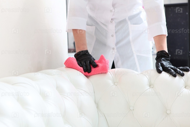 Женщина вытирает белую кожаную обивку дивана салфеток. Уборка кожаного дивана. Чистка мебели. Белый кожаный диван. Уборка в салоне красоты