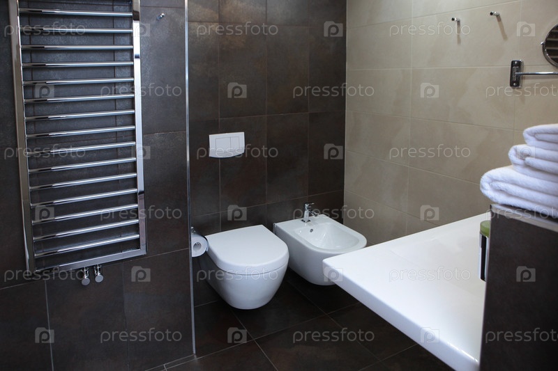 Ванная комната находится в номере отеля, стильные темные плитки на стенах - это концепция отдыха и путешествий