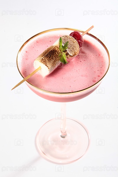 розовый коктейль в высоком стакане. алкогольный коктейль украшен зефирами. фото на белом фоне. близко. изолированный объект