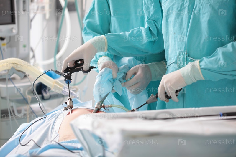 Хирурги проводят лапароскопическую хирургию. Современная операция на животе. Хирургическое вмешательство через небольшие отверстия. Проникновение в живот. Команда хирурга