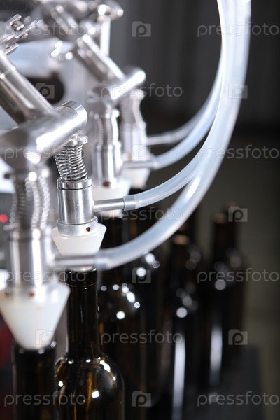 Производство вина. Вино нового урожая бутилируется. Несколько бутылок без ярлыков. Небольшая винодельня. Бутылки молодого вина