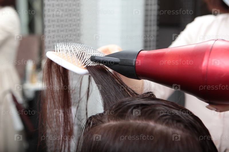 Парикмахер-стилист работает над прической женщины в салоне.Сушить длинные коричневые волосы с помощью фризеры и плоской щетки.Уход за волосами. Понятие красоты