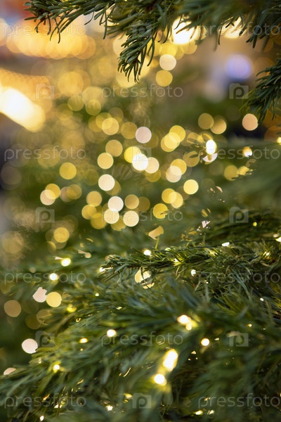 Рождественские огни и ветви сосны. рождественская текстура открыток. гирлянда с огнями на елке. место для рекламы