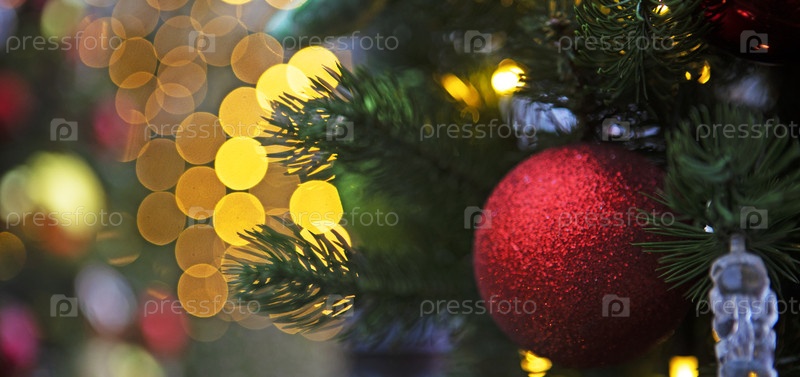 Ветка рождественской елки украшена красными шарами. История новогодней открытки. Красный шар на дереве Рождества. Новогодний бокех. Узкий баннер