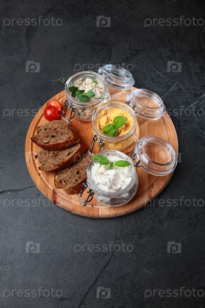Тарелки в ассортименте расположены в банках. Паста печени. Кусочки ржаного хлеба. Здоровый завтрак. Впечатляющая порция