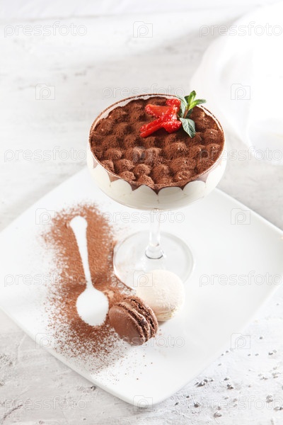Тирамису-десерт в высоком стекле. Отличная презентация. Итальянский многослойный десерт с сыром маскарпоне. штенцера в форме ложки какао