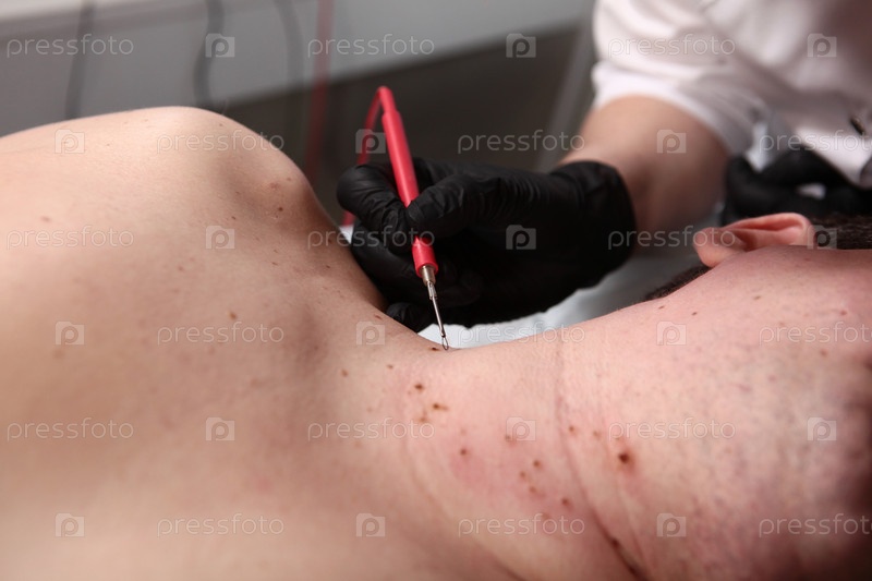 Хирург удаляет многие небольшие папилломы с помощью лазера на человеческом теле, обжигая кожу, ближайший осмотр. Удаление невуса, родинки, папилломы или родимого пятна, хирургическая процедура. Концепция однодневной операции