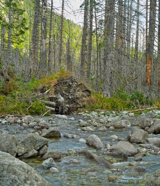 Дикая горная река, протекающая через скалистые лесные покровы реки
