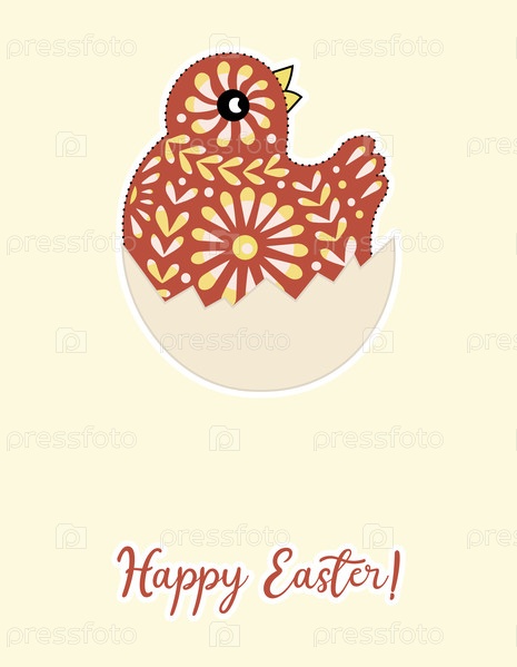 Милая векторная карта с пасхальным стилизованным цыпленком, выходящим из яичной скорлупы на желтом фоне