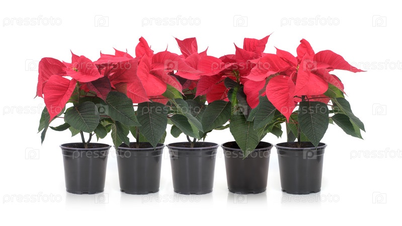 Набор из трех растений рождественской поинсетсии в черных горшках изолирован на белом фоне, вырезка готова. очень высокое разрешение