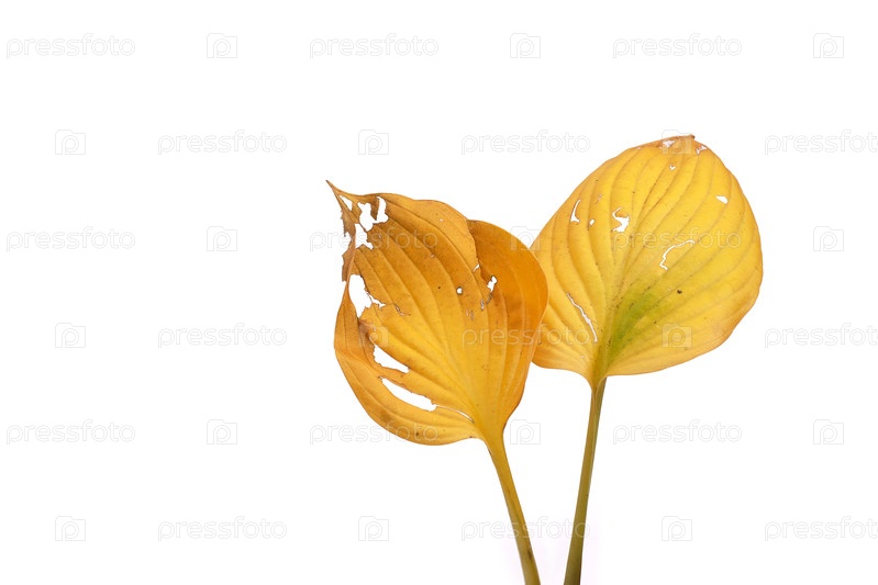 Закройте два перекрывающихся желтоватых листа Hosta, изолированных на белом фоне и вырез готов