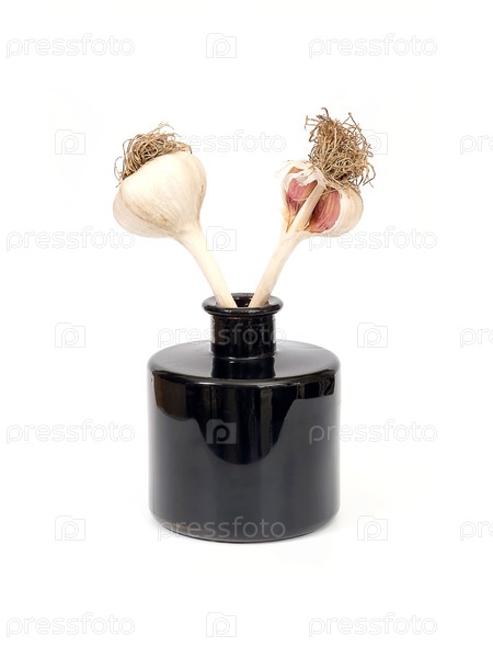 Натюрм с сухим чесноком в черной вазе изолирован на белом фоне