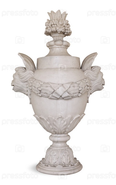 Классическая садовая ваза из белого камня изолирована на белом фоне с отражением. Дизайнерский элемент с обрезкой пути. Очень высокое разрешение