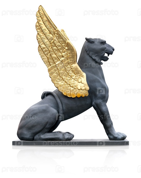 Бронзовый уличный фонарь (мифологический грифон с золотыми крыльями) изолирован на белом фоне