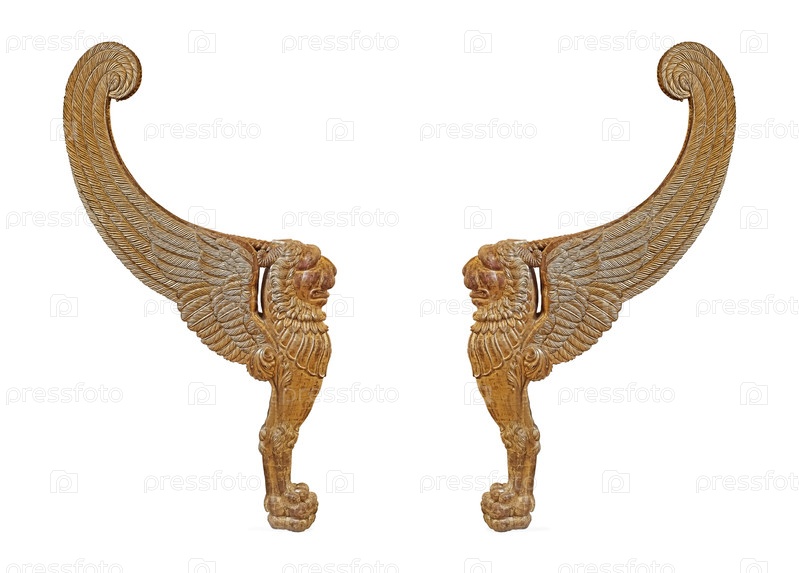 Декоративный элемент в виде золотой головы льва изолирован на белом фоне