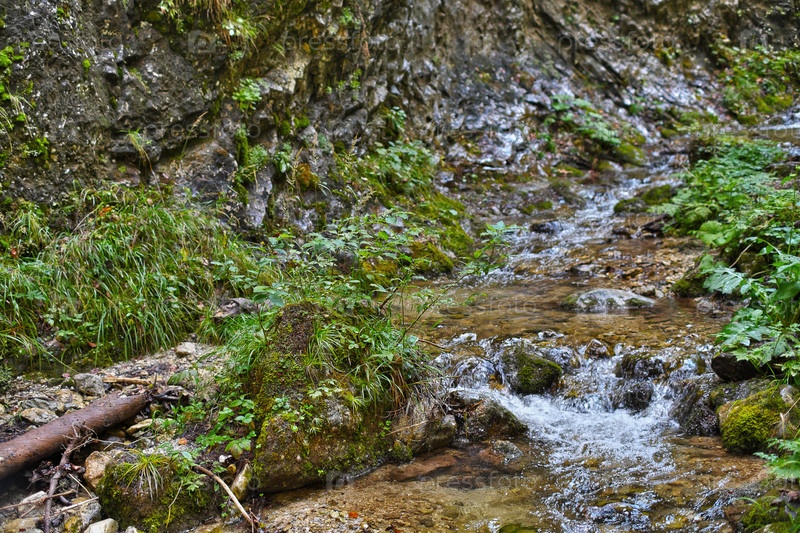 Сера лесный поток с деревьями, фильтрующими солнечный свет