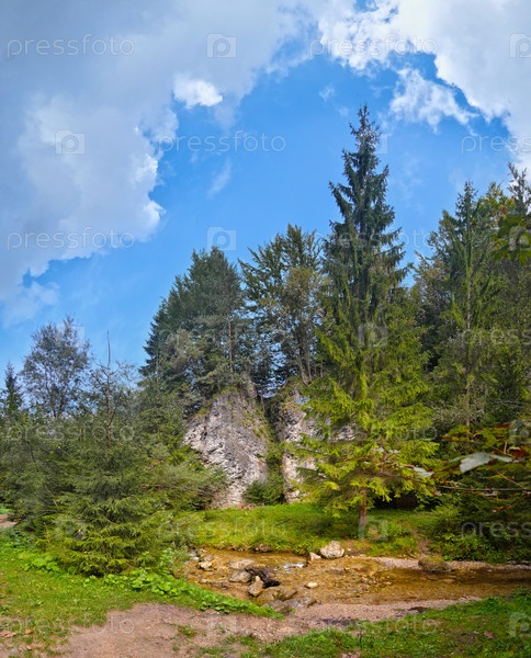 Величественный пейзаж горного леса с солнечными скалами и ручкой. Эпическая сцена дикой природы. Очень высокое разрешение