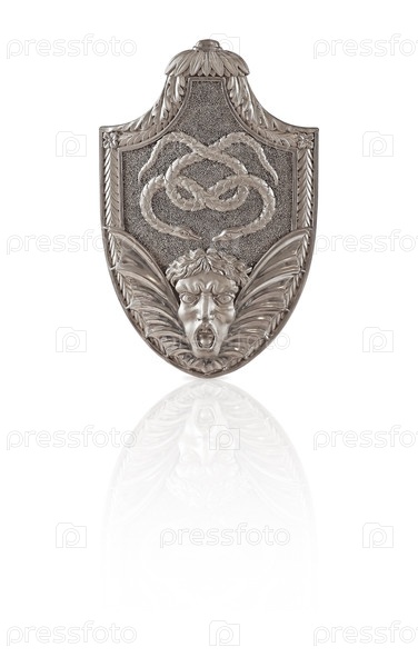 Серебряный щит изолирован на белом фоне с изображением мифического монстра Медузы Горгоны
