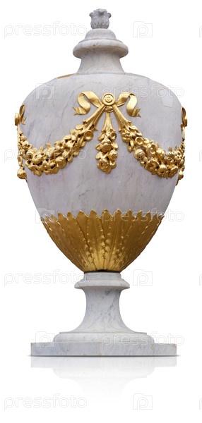 Древняя декоративная мраморная ваза с золотым цветочным украшением изолирована на белом фоне