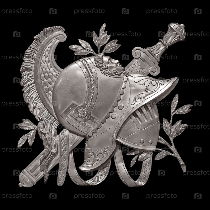 Серебряный декоративный элемент интерьера с изображением шлема из древнегреческого мифа.Элемент изолирован на черном фоне