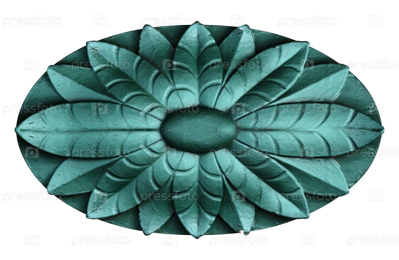 Овальный деревянный зеленый декоративный элемент с цветочным узором выделяется на белом фоне