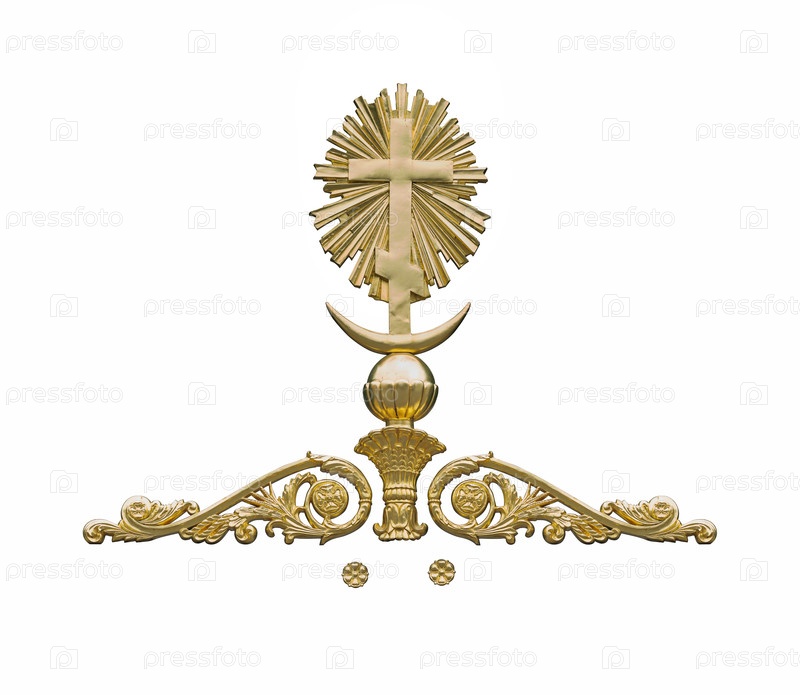 Золотой декоративный элемент с крестом выделен на белом фоне