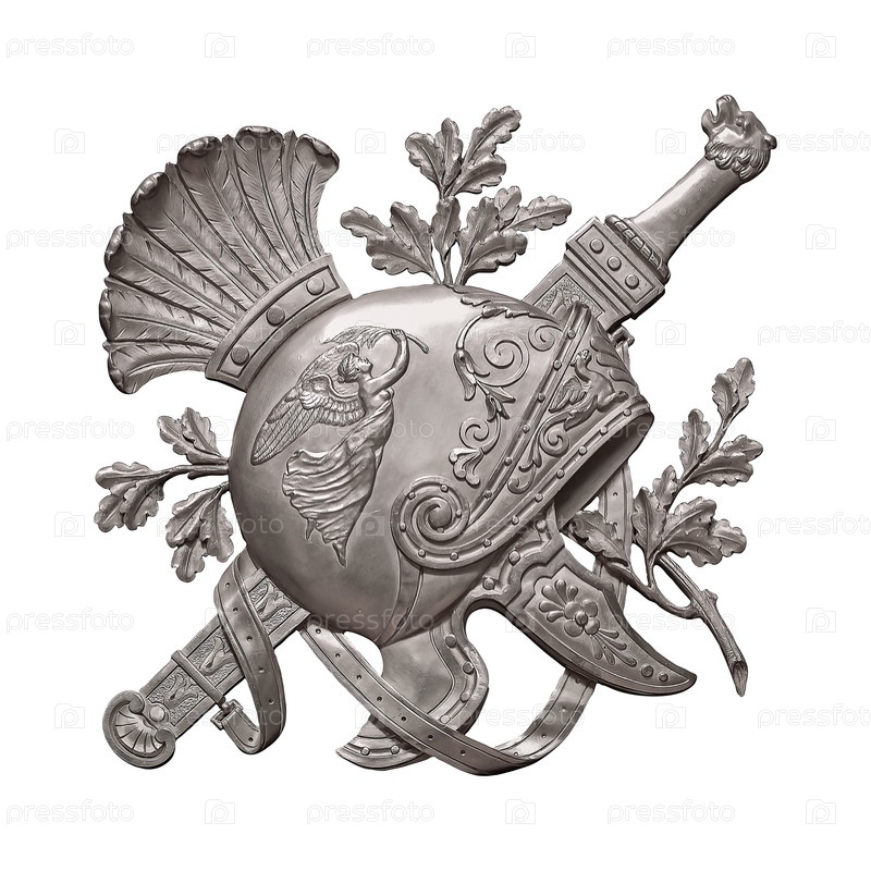 Серебряный декоративный элемент интерьера с изображением шлема из древнегреческого мифа.Элемент изолирован на белом фоне